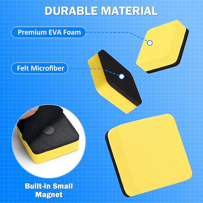 - DURABLE AND WASHABLE: Our dry erasers are made of premium quality EVA foam and high-density felt bottom, non-toxic, and easy to clean the erase markers on glass or white board. And the felt side of the eraser is magnetic and can be absorbed to the whiteboard. The erasers are hand-washable with water and soap for reuse