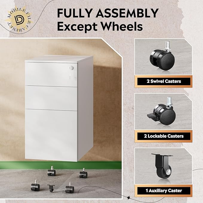 - Built-in Lock: This pedestal cabinet with a built-in lock that secures all three drawers, keeping your personal documents, receipts, important papers and bills safe and organized. Perfect for office, workplace, home to keep your everyday files close and easy to find.