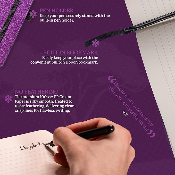 - HIGHEST-QUALITY WRITING PAPER: Dingbats Purple Hippo Medium A5 Notebook Journal has 192 pages-96 sheets of no bleed, smooth writing, Cream 100gsm, acid-free fountain-pen friendly, perforated dotted paper in a flat lay design.
