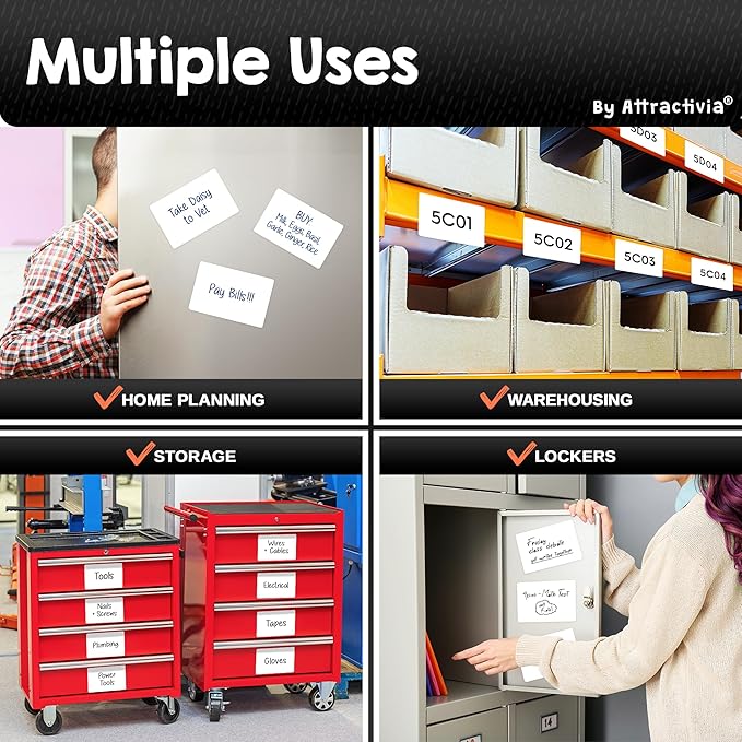 - Rewritable 100,000+ Times: Unlike flimsy labels that degrade over time, our white board magnetic labels are engineered to be erased and rewritten over 100,000 times without losing quality. The advanced coating prevents ink buildup, so every wipe restores a brand new surface, saving you money while reducing waste!