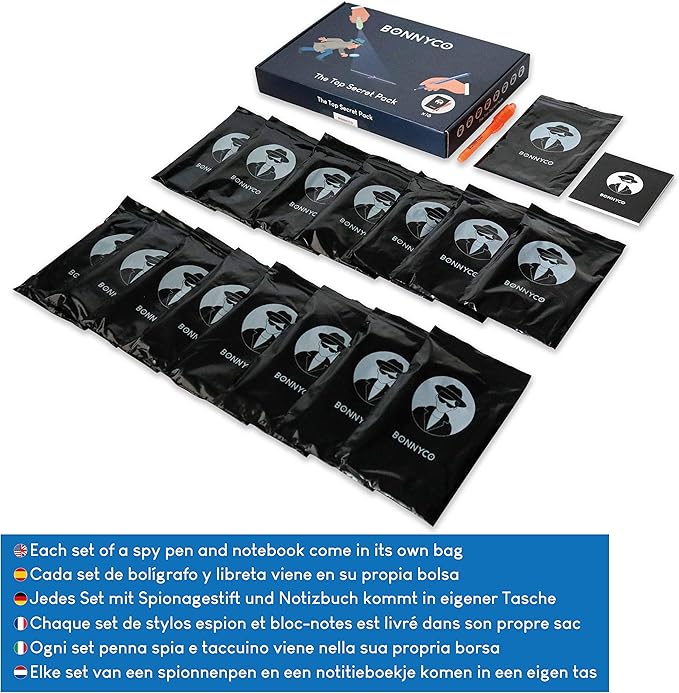 - 🕵 PACK x 16 SPIES 🕵 Our Top Secret Pack spies includes 16 sets of 1 x 5.11 in invisible ink pen with UV light (batteries included) and a small notepad. There are a total of 16 magic pens with 8 different color casing: red (x2), yellow (x2), orange (x2), green (x2), blue (x2), pink (x2), violet (x2) and fuchsia (x2). The transparent ink is the same color for all