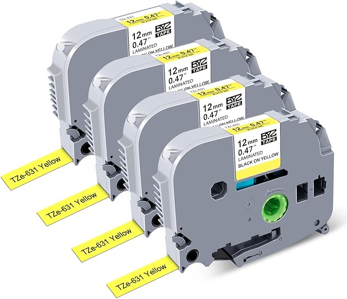 - 4Pack Compatible with Brother P Touch TZe-631 Label Maker Tape; Size: 1/2 Inch (12mm) Width, 26.2 Feet (8m) Length each pack; Color: Black Ink on Yellow Tape