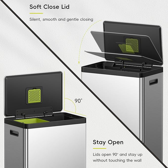 - Dual Compartment Trash Can - Easily distinguish between waste and recyclables with 2 removable 20 liter, color-coded inner buckets.