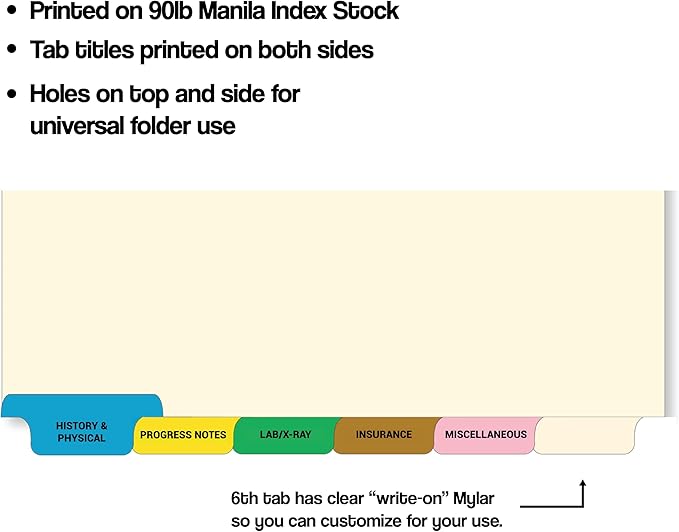 - DIVIDER SET DETAILS: Each set of file dividers is pre collated and has 6 color coded tabs. Each set consists of the following pre printed tab titles: Position 1 - HISTORY & PHYSICAL (Blue Colored Tab), Position 2 - PROGRESS NOTES (Yellow), Position 3 - LAB/X-RAY (Green), Position 4 - INSURANCE (Brown), Position 5 - MISCELLANEOUS (Pink), Position 6 - BLANK WRITE-ON. Contains 130 complete sets of 6 index tabs.