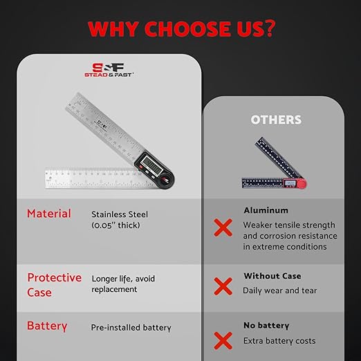 - Durability: Angle finder tool digital made from high tensile strength stainless steel with an etched scale; this ruler withstands frequent use and maintains high precision in harsher environments with corrosion resistance superior to that of aluminum