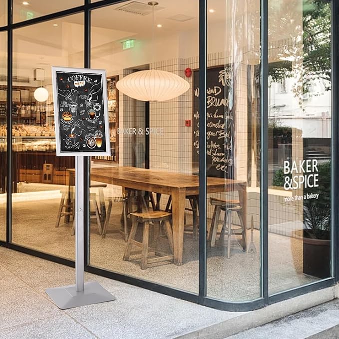 - Easy Poster Changes,Multiple Usage - Front load open snap frame for quick and easy poster changes.Sturdy metal material floor standing sign holder,ideal for exhibition,showrooms, restaurant, supermarket, shopping malls for posters.