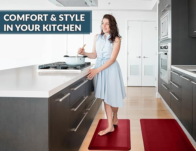 - Slip-Resistant and Stain-Resistant Surface: Stay safe and clean with our anti fatigue mats for kitchen floor that feature a non-slip backing to keep it securely in place. The stain-resistant material is easy to clean and ensures your mat looks new, even with daily use.