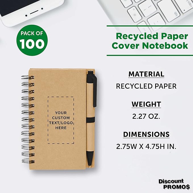 Custom Mini Spiral Notebooks with Black Ink Pens Set of 100, Personalized Bulk Pack - Perfect for School, Office, Business, Home - Black