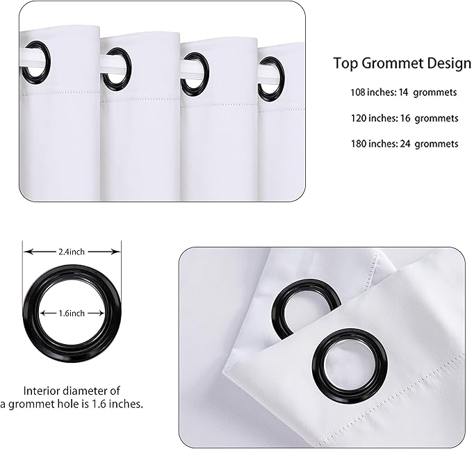 - WHAT'S IN THE PACKAGE? Each set includes 1 curtain panel, and each window drape measures 84-inch (7 ft) length by 108-inch (9 ft) width. 14 elegant metal grommets with 1.6-inch inner diameter, fit well with standard or decorative curtain rods, which makes the curtains easy to install and slide.