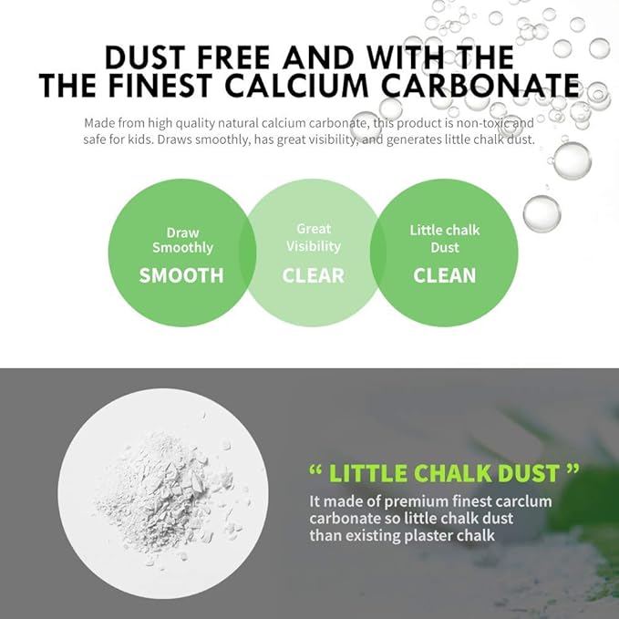- NON-TOXIC, COATED, DUSTLESS : Made from high quality natural calcium carbonate, this product is non-toxic and safe for kids and professional use. All HAGOROMO chalks are well coated to prevent hands from coming into contact with chalk dust when using. Our chalks erase easily leaving little to no residue on the chalkboard when removed. Chalk generates little dust and fallout minimizing chances of smudging and messes when writing or drawing.