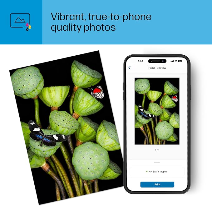 - VIBRANT PHOTOS – Photos that look as vibrant as they do on your screen with true-to-phone quality prints, plus custom photo features in the HP Smart app. HP 5x5" square and 4x12" panoramic photo paper sizes are optimized for the HP ENVY Inspire series