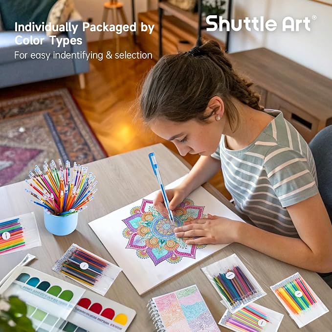 - 120 UNIQUE COLORS: Shuttle Art Gel Pen Refills Set has 120 unique colors, including 7 color types: glitter, neon glitter, metallic, neon, pastel, swirl, standard. Abundant colors with varied color types, fully meet your demands of coloring, writing and drawing.