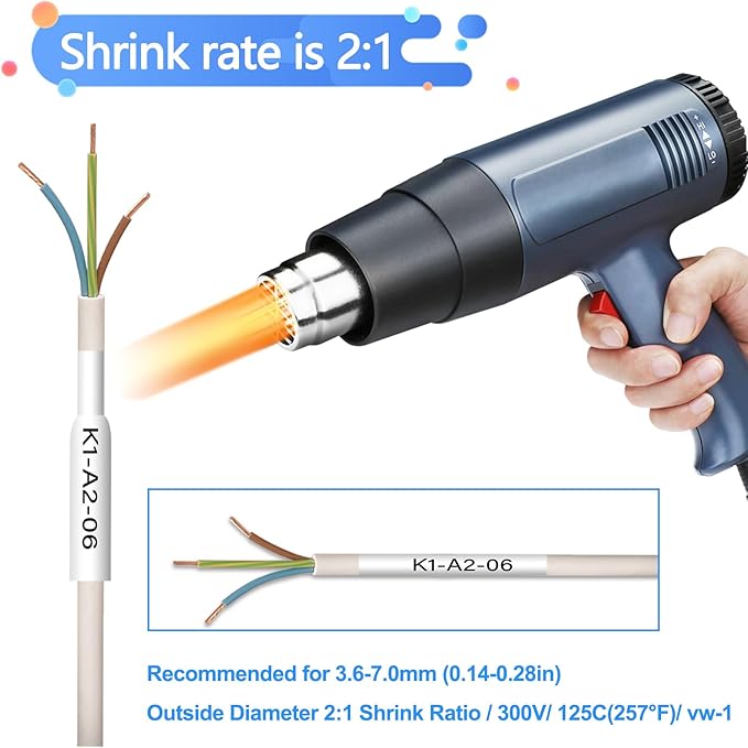 - Labeling cables more efficiently and easily: Tapes featuring shrink ratio of 2:1 which ensures a secure fit on wires and cables. You just need to slide the tube onto the wire/cable and shrink snugly to the cable with a heat gun, labels will shrink up perfectly to the wires and never curl or fall off