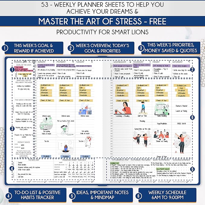 - UNDATED PLANNER - All the tools for success you need to create the life you've always wanted. This large planner measures A5 (8.5 x 6 inches) and boasts thick 100 gsm paper. It features a Vertical Planner layout, offering 256 pages for life transformation, including 53 weekly spreads, 12 monthly planning overviews with reflection sections, 31 dotted journal pages, habit trackers, mind maps, morning and evening routines, inner pockets, pen holder, and comes in a gift box. The planner comes with 539 productivity stickers that can be used to mark important dates, tasks, or milestones. This life planner is UNDATED giving you the freedom to start your journey whenever suits you best