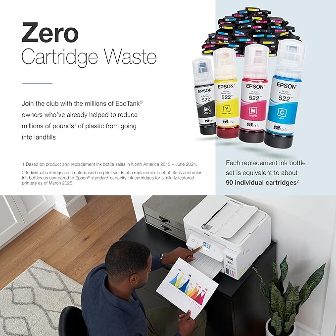 - Innovative Cartridge-Free Printing ― High-capacity ink tanks mean no more tiny, expensive ink cartridges; Epson’s exclusive EcoFit ink bottles make filling easy and worry-free