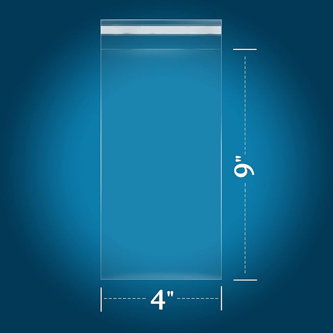 - [SPECIFICATION]: 200 PCS - 4" x 9"(Excludes Glue Flap) Resealable Cellophane Style Bags - Self Sealing. 1.4 Mil Thickness.