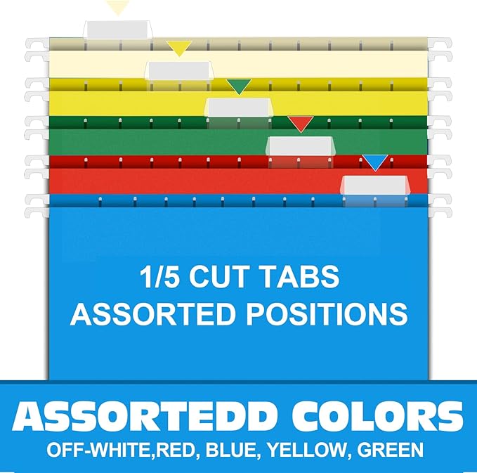 - HANGING FOLDERS SET: Contains 30 extra capacity folders with 30 cardboard supports, 30 printable label sheets, 30 clear plastic tabs and comes in 5 assorted primary colors (off-white, red, blue, yellow, and green) to make color coded filing a snap.