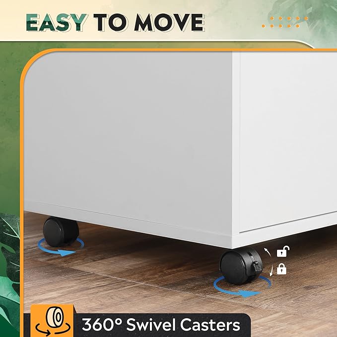 - Easy Mobility: The wooden file cabinet is equipped with 5 rolling wheels, allowing it to be easily moved and positioned beside or under desk. The front 2 wheels have built-in brakes and the bottom center is equipped with anti-tip casters to keep the cabinet stable.