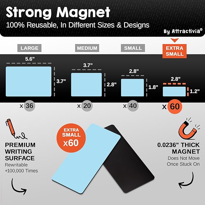 - Instant Organization: Our set of 60 dry erase magnetic labels is perfect for creating writable noticeboards or labeling items at home, in the office, or in a store. These dry erase magnetic labels for dry erase board are also ideal for sorting, identifying, and organizing with ease.