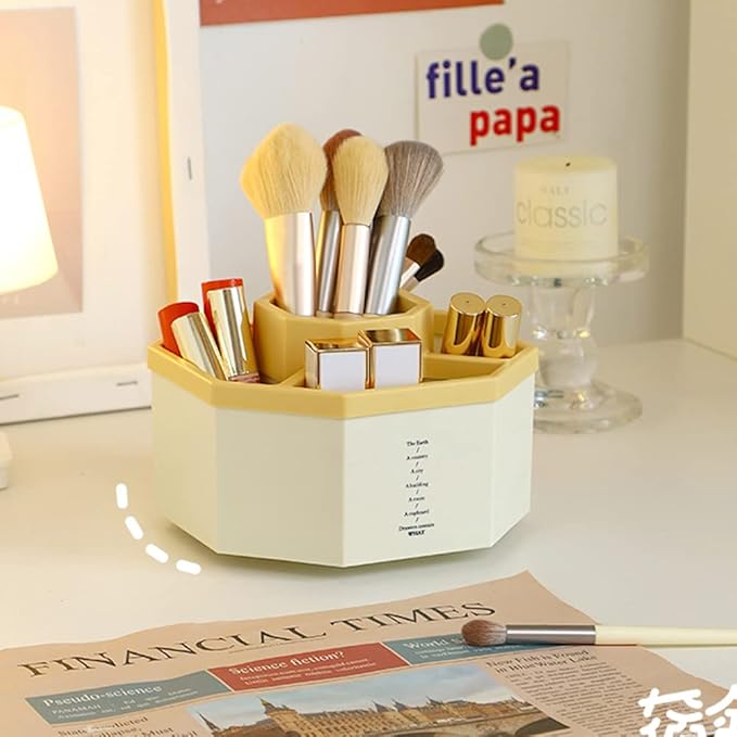 Desk Organizer, 360-Degree Rotating Multi-Functional Pen Holder, 5 Compartments Desktop Stationary Organizer, Home Office Art Supply Storage Box Caddy (White+Yellow)
