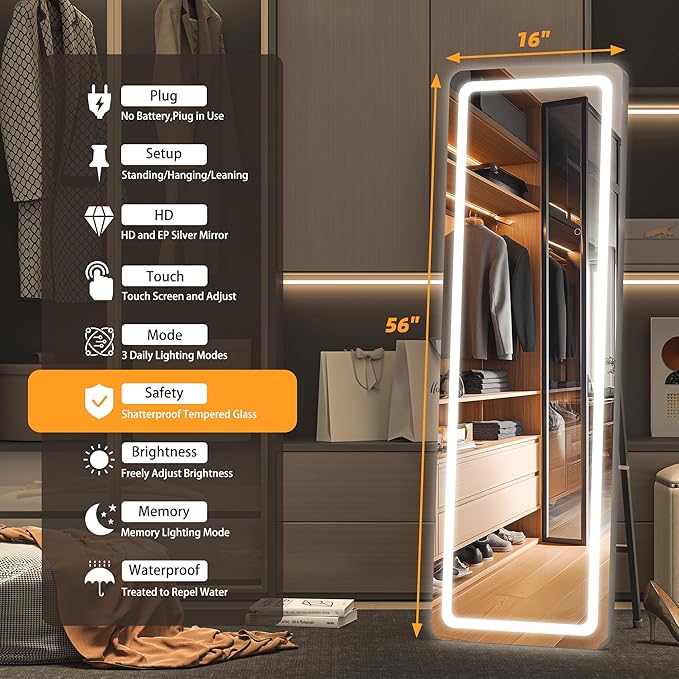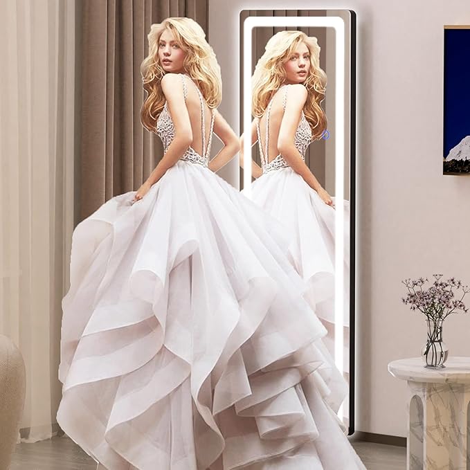 - 【Dimmable & 3 Color Temperature】This lighted full length mirror is multifunctional. You can press the button to change the color temperatures: Warm(3000K), natural (4000K) and white(6000K). You can also dim the brightness to your comfortable level. All these will be easily controlled by the touch button.