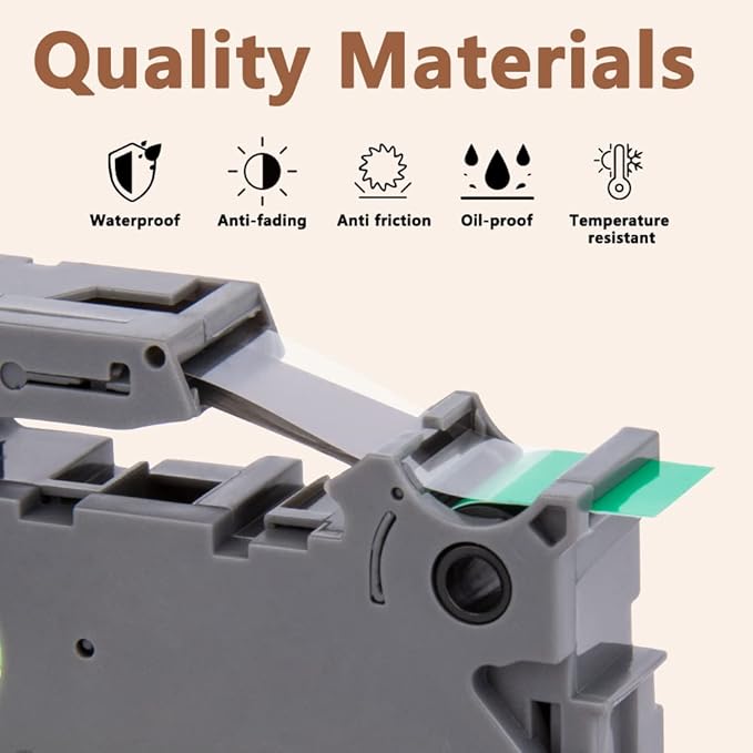 - Product features : Split back, water resistant, fading resistant, abrasion resistant, temperature resistant, strong adhesive. This compatibel 12mm tze-731 Black on Green label tape is suitable for indoor and outdoor use