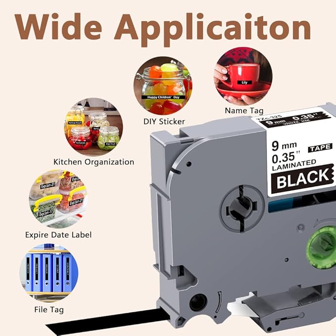 - Wide application: Compatible for Brother P-touch TZe 325 label tape is ideal to print clear, good-looking and durable labels. These labels are great for shelving, kitchen use, cabinets, file folders, USB sticks, food containers, storage boxes, personal possessions, children's school equipment with it's superior adhesive