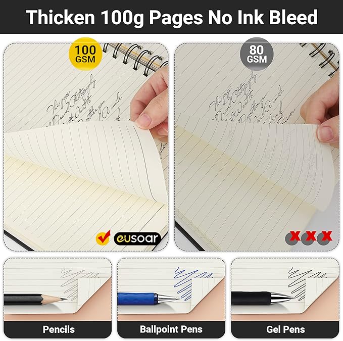 - 【Package Included】3 packs A4(8.5"x11") Large lined(7mm/0.28" line space) notebooks, each book has 240 pages/120 sheets of paper. And 100gsm thickened inner paper is great for smooth writing with no ink bleed. Also the beige color could greatly protect our eyesight.