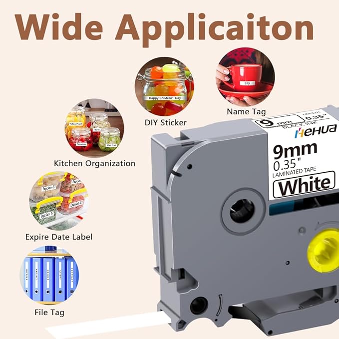 Hehua 9mm 0.35 Extra Strength Adhesive Laminated White Tape Compatible for Brother TZe-S221 TZeS221 TZ-S221 TZS221 for Ptouch PT D210 D200 H110 H100, 3/8'' x 26.2ft Black on White, 4 Pack
