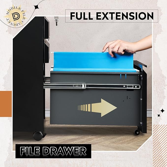 - Modern Design to Enhance Any Workspace: The modern design makes the file cabinet a highlight in home or corporate offices. Whether placed next to a desk or underneath it, this mobile filing cabinet helps you organize your work stylishly. Utilizing full-extension drawer slides, the drawers open completely, allowing easy access to the contents at the back of the drawers.