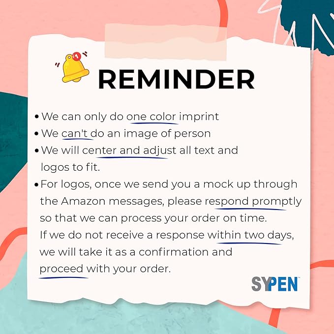 - Logos: if you upload a logo at the "customize now" button, please look out for our message via the amazon messaging with a proof for approval. If we do not receive a response with approval or changes within two business days, we will proceed with the order according to the mock up we sent. Note, we do not send proofs for text only.