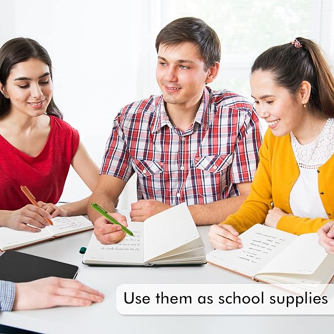 - 5 different vintage colors for these notebooks. There are 5 Black Retractable Pens in the box. You can use it as soon as you receive it. These pens are perfect to be put in the pen holder of the classic ruled notebook. Large tube has the capacity of restoring more ink, which makes them long lasting. Quick drying can avoid smearing and smudge.