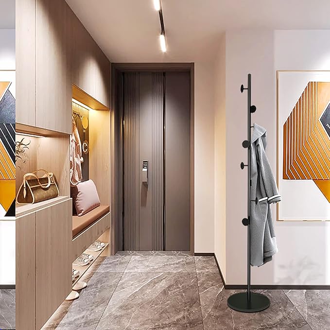 Coat Tree Freestanding, Metal Coat Rack Tree with 8 Hooks, Free Standing Hanger for Hats Scarves Purses Umbrellas, Coat Stands with Stable Base for Entryway Bedroom, Black
