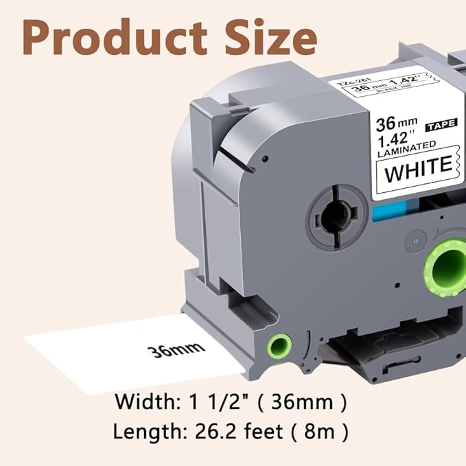 - Product features : Split back, water resistant, fading resistant, abrasion resistant, temperature resistant, strong adhesive. This compatibel label tape 36mm TZe-261 Black on White is suitable for indoor and outdoor use