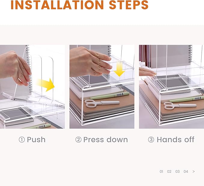 - Practical Desk Organizer: This acrylic desk organizer has two organization areas at the top and bottom, the top is a 4 compartment vertical baffle that requires simple insertion and installation, the rest is one piece,the bottom is a drawer(drawer requires no assembly) for storing standard A4 letter size papers, organize your desk, make the work area clean and tidy, organized, warm and soothing, very perfect for office organization and storage