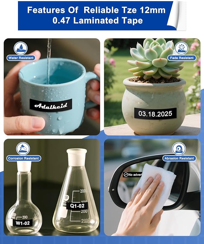 - Laminated Tape: Replacement for Brother tz tape 12mm 0.47 laminated black tape withstands Water / Fading / Temperature / Abrasion / Grime / Grease / Chemical, suitable for outdoor places such as construction sites, garden construction, markets, etc.