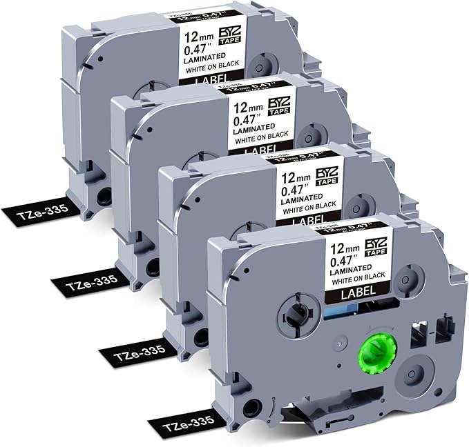 - 4-Pack Replacement for Brother P Touch label maker tape TZe-335 TZe335, white ink on black tape. Width: 1/2 Inch (12mm 0.47") , Length: 26.2Feet(8m) for each TZe-335, 104.8feet(32m) in total for 4 pack.