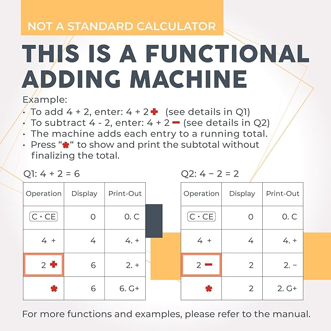 - [IMPORTANT!] - This is an adding machine and DOES NOT function like a standard desktop calculator. For example, to do the equation 4 - 2, you would need to press “4” then “+” then “2” then “-” then “equals” to get the right answer. Tutorials and examples are provided in the detailed instruction manual.