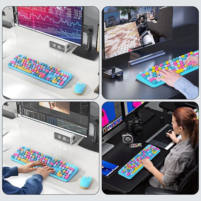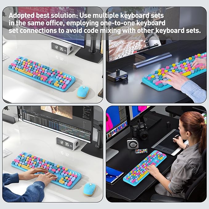 - Colorful Keyboard Shared Receiver : A USB receiver simultaneously drives the keyboard and mouse, enabling wireless transmission with a stable and delay-free signal,2.4G wireless transmission technology, supporting multiple computer types.The design incorporates splash resistance, with a waterproof conductive film that allows liquid to flow out from within the keyboard membrane. The mouse requires one 1.5V AA battery (not included), while the keyboard requires two 1.5V AAA battery (not included).