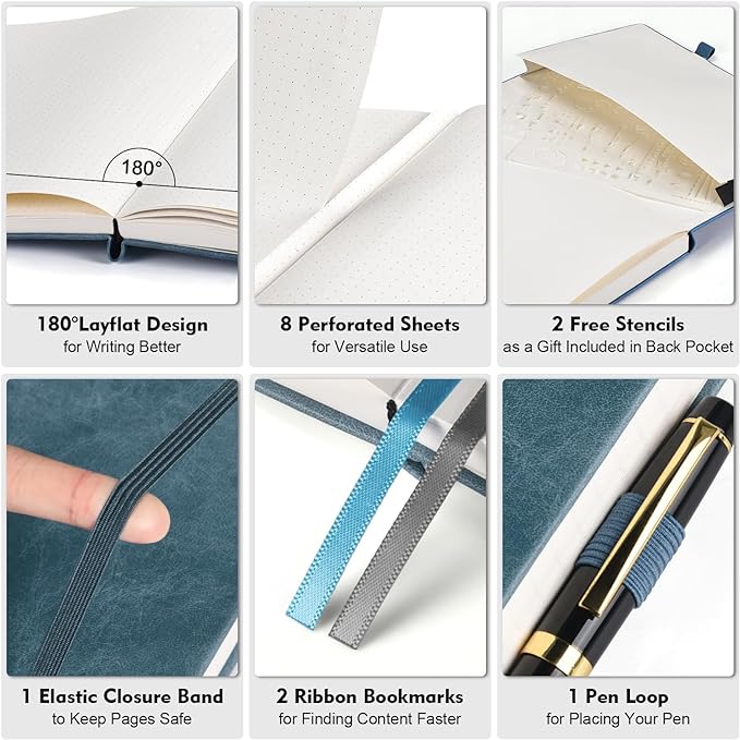 - 【User-Centered Design】❶ Add 2 subtle markers on the pages to assist with QUICK PAGE LAYOUT, allowing you to easily locate the center of rows and columns without counting every time; ❷ Include all the essential features of a perfect dot grid journal, such as 8 perforated sheets, 2 bookmarks, elastic closure band, pen holder, and back pocket; ❸ BONUS - 2 stencils are being gifted to you to create your ideal bullet point journal.