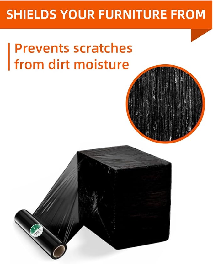 - MULTIPLE PURPOSE USES: Our black stretch film is suitable for both industrial and personal use, making it the perfect choice for packing cargo pallets for transportation or protecting furniture during a move. Its ability to protect items from dirt, tears, and scratches makes it an essential item for any household.