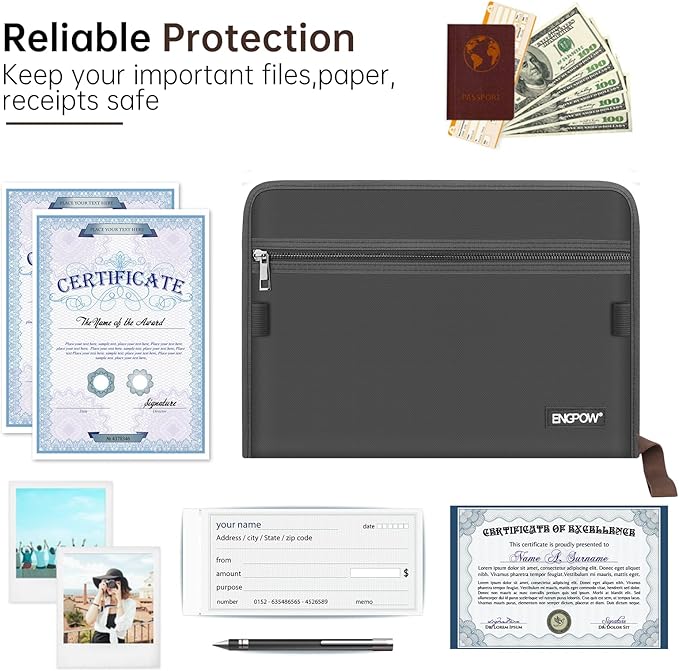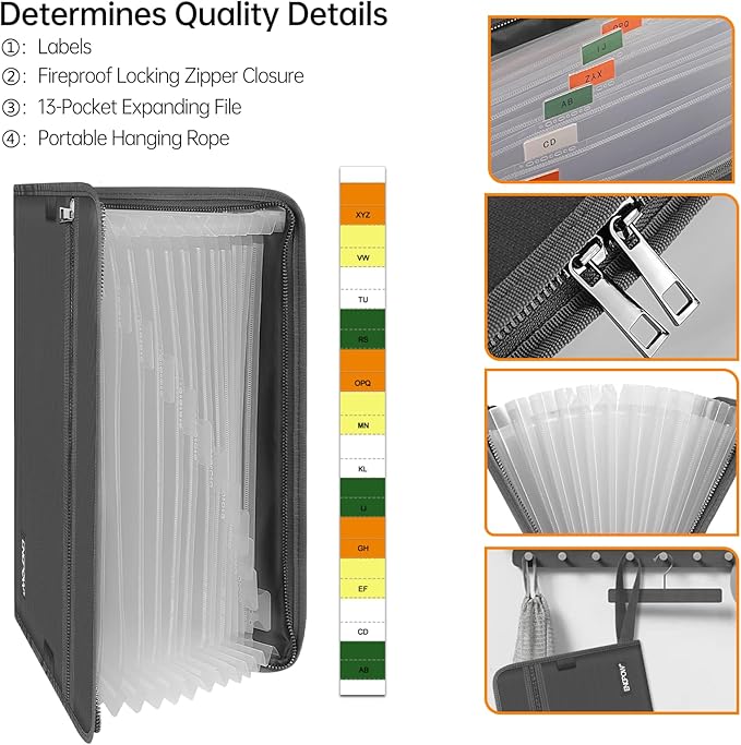 - Innovative Humanized Design: Design with a carrying strap for carrying everything you needed easily. Featuring a double zipper for convenient opening and closing,you won't have to worry about losing any important documents. The included colorful labels make categorizing your files effortless. The fireproof expanding file folder is suitable for business, travel, office, school, home storage, you can be 100% sure that your important documents are in a safe place.