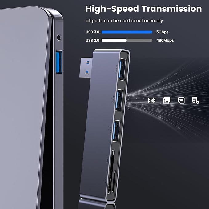 - 【5 in 1 USB Hub】 USB Hub tansfer a single USB A port into 5 data ports(1 USB 3.0 & 2 USB2.0 & TF/SD). Support 4 ports to work at the same time(Note: SD card and Micro SD card cannot be read at the same time), without any pressure, and keep the temperature in the middle range. Plug and play, no need driver, easy to use.