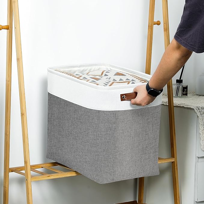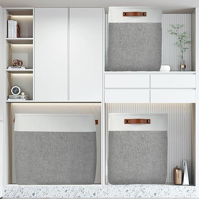- 【Unique Design & Modern & Decorative】Set of 3 large storage baskets, dimensions(each): 17(L) x 12(W) x 15(H) inches. Collapsible storage baskets bring you organizing convenience and a sweet home. Great for socks, underwear, books, magazines, toys, baby clothes, pet products, wipes, towels, decorations, office supplies, DVDs, and gifts. The fabric baskets with neutral colors can match a lot of home styles - keeping your home nice and tidy.