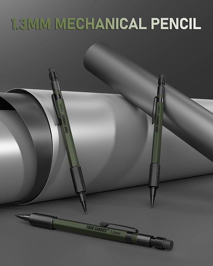 Four Candies 1.3mm Mechanical Pencil Set with 72 Lead Refill, 3PCS Metal Weatherproof Body Heavy Duty Carpenter Pencil, 3 Eraser, 16 Eraser Refill, for Outdoor Woodworking Drafting Marking with Case