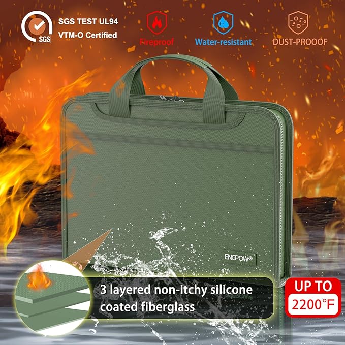 - High-Quality Materials: Protect your files with ENGPOW fireproof accordion file organizer.It is made of 3-layered non-itchy silicone-coated fiberglass which withstand the temperature up to 2200℉.It has been passed by SGS TEST(UL94 VTM-0 Certified).Fireproof File Folder is fireproof&Water-resistant,which can effectively protect your important documents in a fire,flood,and wet weather. They will further keep your files intact.Giving you time to save your important documents when disaster strikes