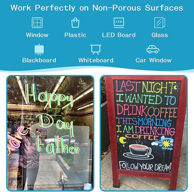 - 【Bright Neon & Non-Toxic】Window markers for glass washable for kids. With 8 vibrant colors, window paint for glass spark children's creativity and imagination, making learning more fun. These high-quality water-based ink window chalk markers for glass are dustless and non-toxic, making them perfect for painting with children to decorate windows for Christmas and Halloween, pumpkins, or to draw bouquets of flowers as gifts for Father's Day and Mother's Day.