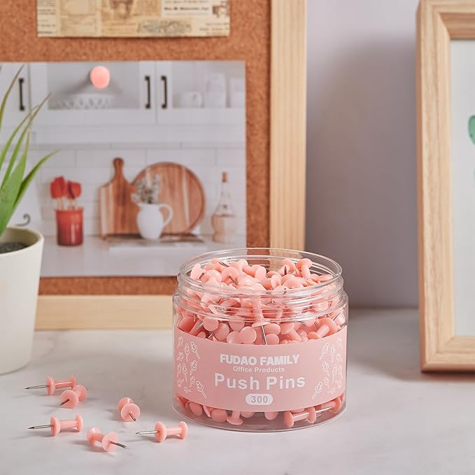 FUDAO FAMILY 300pcs Push Pins for Bulletin Board, Thumb Tacks for Wall Corkboard, Map Pins - Home Office School Craft Projects Plastic Head Steel Push Pin (Pink)