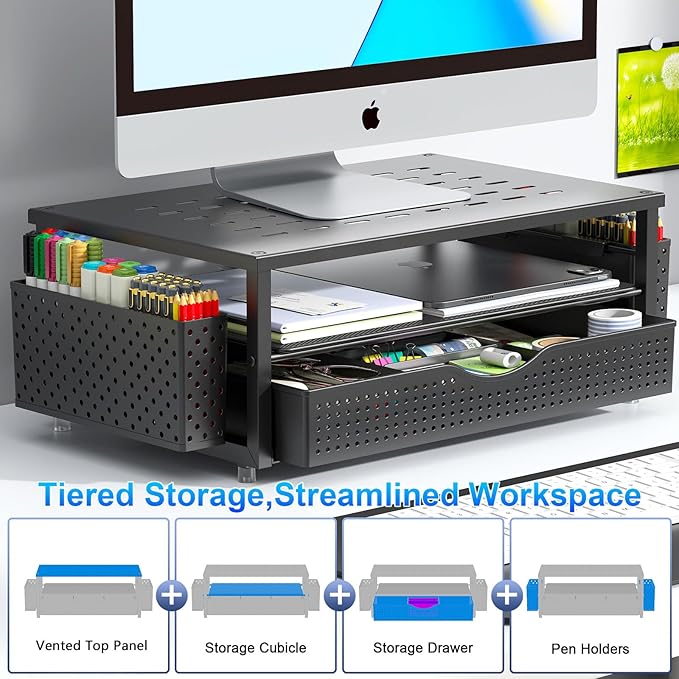 - 【Improved Work Efficiency】: The monitor riser comes with a sliding drawer and two pen holders. It accommodates various office desk items, saving space. It helps you quickly identify the contents of each compartment, doubling your work speed.