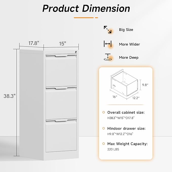 - đď¸ăSUPER FUNCTIONAL VERTICAL FILING CABINETă: Our this file cabinet has three large drawers with 15.7 inches depth, which provides you with large enough storage space. And it is equipped with adjustable hanging rods to store different types of files, such as letter, legal, A4, F4 size folders. It is perfect for you to customize the way you organize your files!